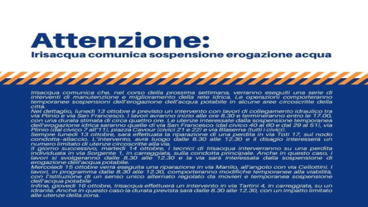 Dopo l'avviso di sospensione erogazione dell'acqua andato a vuoto perchè la società non era pronta ad effettuare il lavoro ci ritenta lunedì.