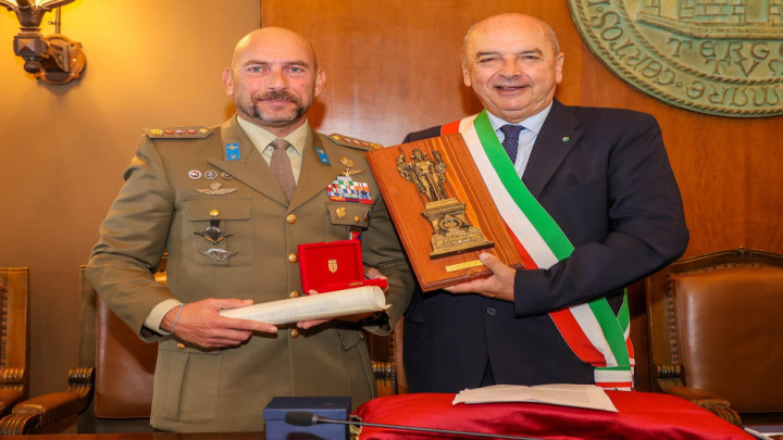 Il sindaco di Trieste, Roberto Dipiazza, ha conferito la cittadinanza onoraria al Comando Militare Esercito Friuli Venezia Giulia nel corso di una cerimonia solenne tenutasi nella Sala del Consiglio comunale, alla presenza del comandante colonnello Giuliano Innecco, del presidente del Consiglio comunale Francesco Di Paola Panteca e delle massime autorità civili, militari e religiose. La motivazione sottolinea il riconoscimento per il costante impegno a servizio della comunità e della Nazione, il presidio di valori patriottici e di disciplina, il contributo alla promozione della cultura, della legalità e della solidarietà civile, rafforzando il legame tra le Forze Armate e la città. Dopo la firma del Libro d’Oro da parte del colonnello Innecco, la pergamena e la medaglia di civica benemerenza sono state consegnate dal primo cittadino. Il comandante ha espresso gratitudine per il riconoscimento, definendolo “motivo di vanto non solo personale ma soprattutto per l’Ente che rappresento”, ribadendo lo storico rapporto di collaborazione tra la città e il CME FVG, consolidato anche dall’operazione “Strade sicure”. Nel corso della cerimonia il colonnello Innecco ha donato al sindaco Dipiazza una riproduzione in bronzo della tomba del Milite Ignoto, un elmetto della Prima Guerra Mondiale e il crest del Comando Militare Esercito FVG.