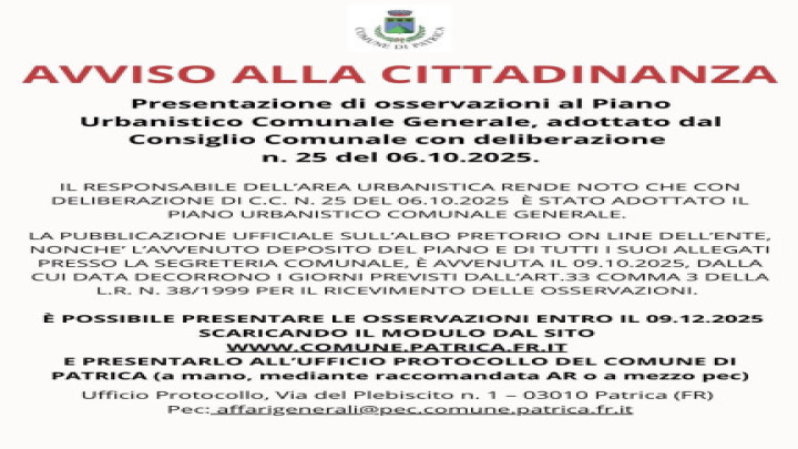 Il Comune di Patrica informa che dal 9 ottobre 2025 è ufficialmente pubblicato sull’Albo Pretorio il Piano Urbanistico Comunale Generale (PUCG), adottato dal Consiglio comunale con deliberazione n. 25 del 6 ottobre. Contestualmente, il Piano e i relativi allegati sono stati depositati presso la Segreteria comunale. Da quella data decorrono i 60 giorni previsti dalla normativa regionale per la presentazione delle osservazioni: i cittadini interessati potranno farlo entro e non oltre il 9 dicembre 2025, utilizzando l’apposito modulo disponibile sul sito istituzionale del Comune. Le osservazioni, debitamente compilate, potranno essere consegnate a mano all’Ufficio Protocollo, inviate tramite raccomandata A/R oppure via PEC. Tutti i documenti e il modulo sono scaricabili online al seguente link: PUCG – Comune di Patrica.