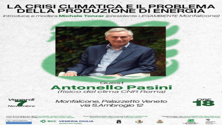 Si apre venerdì 7 novembre alle ore 18, al Palazzetto Veneto di Monfalcone (via San Ambrogio 12), la rassegna promossa da Legambiente Monfalcone dal titolo “Il nostro futuro comune, tra sviluppo insostenibile e crisi climatica”. Il primo incontro vedrà la partecipazione di Antonello Pasini, fisico del clima del CNR di Roma, considerato una delle voci scientifiche di riferimento in Italia sul tema della crisi climatica. L’appuntamento sarà dedicato all’analisi delle cause e delle conseguenze del cambiamento climatico, con particolare attenzione alle prospettive e alle soluzioni per la transizione energetica, con l’obiettivo di superare semplificazioni e disinformazione e promuovere modelli di sviluppo più sostenibili. L’iniziativa è realizzata con il contributo del Consiglio regionale del Friuli Venezia Giulia e della BCC della Venezia Giulia, in collaborazione con l’associazione culturale “Leali delle Notizie” e con il patrocinio dei Comuni di Monfalcone, Ronchi dei Legionari e Staranzano.