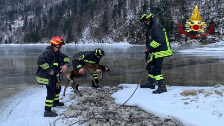 Giunti sul posto, i soccorritori hanno valutato rapidamente la situazione, operando con particolare attenzione per evitare ulteriori traumi all’animale e garantire la sicurezza dell’intervento. Utilizzando un lazo, i Vigili del fuoco sono riusciti ad agganciare il cervo e a trascinarlo lentamente fino a terra ferma, liberandolo dal ghiaccio. Una volta tratto in salvo, il giovane esemplare è stato sottoposto a un rapido controllo per verificare l’assenza di ferite o lesioni. Accertate le buone condizioni generali, il cervo è stato accompagnato ai margini del bosco e rimesso in libertà in un’area sicura, lontana dal lago ghiacciato.