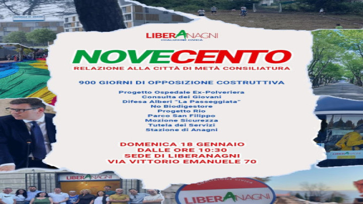 “Novecento” è una cifra simbolica, che segna il giro di boa del mandato consiliare. Dopo le precedenti rendicontazioni pubbliche alla città, denominate “Cento” e “Cinquecento”, LiberAnagni prosegue il proprio percorso di trasparenza e confronto con i cittadini, scegliendo ancora una volta di fare il punto sull’attività svolta e sulla direzione futura della città. A metà della consiliatura riteniamo doveroso fermarci, non per un esercizio autocelebrativo, ma per valutare con onestà il lavoro svolto e le scelte che l’amministrazione sta compiendo. In questi anni abbiamo portato avanti un’opposizione di merito, fondata sullo studio degli atti e sulla formulazione di proposte concrete, affrontando temi centrali per la vita quotidiana dei cittadini: sanità, ambiente, servizi pubblici, sicurezza e qualità della vita. Abbiamo scelto consapevolmente di non limitarci alla denuncia, ma di affiancare al controllo dell’azione amministrativa una visione alternativa di città, mantenendo un rapporto costante con associazioni, comitati e singoli cittadini. La rendicontazione, per noi, non è un atto formale, ma un dovere politico verso la comunità che rappresentiamo “Novecento” si inserisce quindi nella continuità di questo metodo: un momento pubblico di confronto, in cui raccontare il percorso svolto, evidenziare le criticità emerse e discutere apertamente delle prospettive future per Anagni. Ci troverete domenica 18 gennaio, dalle ore 10:30 e a seguire, presso la sede di LiberAnagni in via Vittorio Emanuele 70. L’iniziativa è aperta alla cittadinanza”.