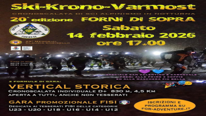 Sabato 14 febbraio 2026 Forni di Sopra ospiterà la 20ª edizione della Ski Krono Varmost, la storica cronoscalata di sci alpinismo in notturna organizzata dalla Società Sportiva Fornese. L’evento, tra i più attesi della stagione invernale nelle Dolomiti Friulane, richiamerà atleti e appassionati da tutto il Triveneto per una sfida spettacolare sulle piste del Varmost. La gara si svolgerà lungo il tracciato storico che dal fondovalle conduce a Malga Varmost, a quota 1.780 metri, su un percorso di 4,5 chilometri con 830 metri di dislivello positivo. La partenza in linea (mass start) è fissata alle ore 17.00, in un contesto suggestivo che unisce la fatica agonistica all’atmosfera unica della montagna al tramonto. La discesa dovrà essere effettuata obbligatoriamente con gli sci; non è ammessa la partecipazione con ciaspole o ramponcini. La Ski Krono Varmost sarà valida anche come 23° Memorial Claudia Corisello, dedicato alla giovane alpinista fornese. Sono previste due formule di partecipazione: una agonistica, gara promozionale FISI riservata alle categorie giovanili Under 12, 14, 16, 18, 20 e 23 e valida per il Campionato regionale FISI FVG; e una amatoriale, la “Vertical Storica”, aperta a tutti gli appassionati di sci alpinismo, con particolare attenzione agli amici del CAI, del Soccorso Alpino e a chi partecipa alla manifestazione fin dalla prima edizione del 2003. Oltre alla competizione sportiva, l’edizione 2026 proporrà numerosi premi e momenti conviviali. In occasione di San Valentino, sono previsti riconoscimenti per le coppie partecipanti e per la migliore maschera di carnevale. Sarà inoltre assegnato il 23° Trofeo Claudia al volontario del Soccorso Alpino che si avvicinerà maggiormente al tempo medio di gara, oltre al premio ai “Senatori”, riservato a chi ha preso parte a tutte le venti edizioni della cronoscalata. L’evento è organizzato dalla Società Sportiva Fornese con il supporto del Comitato FISI FVG, PromoTurismoFVG, del Comune di Forni di Sopra, del Soccorso Alpino e dei volontari. Iscrizioni, regolamento e programma dettagliato sono disponibili sul sito ufficiale www.for-adventure.it.