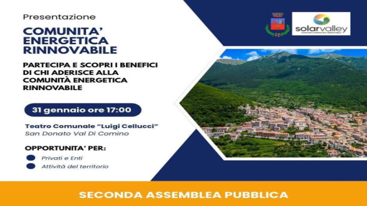Prosegue a San Donato Val di Comino il percorso di informazione e partecipazione promosso dall’Amministrazione comunale sul tema della transizione energetica. Giovedì 31 gennaio alle ore 17.00, al Teatro Comunale “Luigi Cellucci”, si terrà la seconda assemblea pubblica dedicata alla presentazione della Comunità Energetica Rinnovabile “Solar Valley”, un progetto che punta a coniugare sostenibilità ambientale, risparmio economico e valorizzazione delle risorse locali. Nel corso dell’incontro verranno illustrati il funzionamento della comunità energetica, i benefici per cittadini, enti e attività economiche, le garanzie del sistema e le opportunità di adesione. L’assemblea rientra in un più ampio percorso di ascolto e coinvolgimento già avviato dal Comune, con l’obiettivo di accompagnare il territorio verso un modello energetico condiviso e orientato all’autoproduzione e al consumo consapevole. All’iniziativa parteciperanno i responsabili della Comunità Energetica Solar Valley, tra cui l’ingegner Prunotto, che approfondirà gli aspetti tecnici e operativi del progetto. Il sindaco Enrico Pittiglio ha sottolineato come la comunità energetica rappresenti “un’opportunità concreta” in termini di risparmio, tutela ambientale e sviluppo locale, aperta non solo ai cittadini di San Donato Val di Comino ma a tutti i residenti della Valle di Comino collegati alla cabina primaria di Atina. “Come Amministrazione – ha evidenziato Pittiglio – abbiamo scelto di costruire questo percorso insieme alla comunità, attraverso il confronto e la partecipazione, perché la sostenibilità è una sfida che riguarda tutti”.