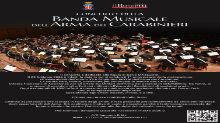 Un grande appuntamento musicale e di solidarietà attende la città di Trieste. Mercoledì 25 febbraio 2026, presso la prestigiosa cornice del Politeama Rossetti - Sala Assicurazioni Generali, si terrà il Concerto della Banda Musicale dell'Arma dei Carabinieri, evento di alto valore artistico e istituzionale. La serata sarà dedicata alla memoria di Salvo D'Acquisto, eroico Vice Brigadiere MOVM dell'Arma dei Carabinieri, nel primo anniversario della dichiarazione di venerabilità. Oltre all'aspetto musicale, l'iniziativa rappresenterà un'importante occasione per far conoscere le attività dell'Opera Nazionale di Assistenza per gli Orfani dei Militari dell'Arma dei Carabinieri (ONAOMAC), ente che assiste oggi oltre mille orfani, garantendo loro sostegno economico e formativo fino al completamento degli studi e, in caso di disabilità, per tutta la vita. Il concerto sarà ad ingresso libero fino ad esaurimento posti. I biglietti, per un massimo di due a persona, possono essere ritirati da oggi presso la biglietteria del Politeama Rossetti. Durante l'evento sarà possibile effettuare una donazione libera a favore dell'ONAOMAC, che opera esclusivamente grazie al contributo volontario dei militari dell'Arma e dei cittadini. Un'occasione speciale per unire cultura, memoria e solidarietà, nel segno dei valori che da sempre contraddistinguono l'Arma dei Carabinieri e il legame con la comunità.
