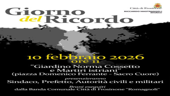 Martedì 10 febbraio 2026, alle ore 11.00, presso il "Giardino Norma Cossetto e Martiri Istriani", (Piazza Domenico Ferrante - quartiere Sacro Cuore) si terrà la cerimonia commemorativa in occasione del Giorno del Ricordo. Alla cerimonia prenderanno parte il Sindaco, il Prefetto e le Autorità civili e militari del territorio. Brani eseguiti dalla Banda Comunale "Romagnoli" della Città di Frosinone.