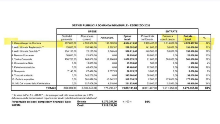 Rispetto alla media degli altri servizi (che è del 69%), la Casa Albergo di Monfalcone è uno dei servizi più "vicini" a coprire interamente i propri costi. Una copertura dell'82% è molto alta per un servizio sociale. Significa che solo il 18% del costo del servizio (circa 881.000 €)è a carico del Comune mentre il resto è pagato direttamente da chi ne usufruisce. Nel 2025 era del 70%. Confronto con altri servizi: Teatro Comunale (copertura al 52%), Trasporto Scolastico (copertura all'11%), Galleria espositiva (copertura al 57%), MU.CA (copertura al 24%). Questo 82% conferma che quasi tutto il costo della struttura si basa sulle rette degli anziani e delle loro famiglie, riducendo al minimo il sussidio comunale rispetto ad altri servizi meno essenziali. Inoltre, un aumento più graduale, condiviso con le famiglie avrebbe permesso una maggior programmazione delle spese famigliari e minor tensione per un aumento cospicuo in un'unica soluzione. La questione non è tecnica, ma squisitamente politica. È chi amministra a fare scelte strategiche.