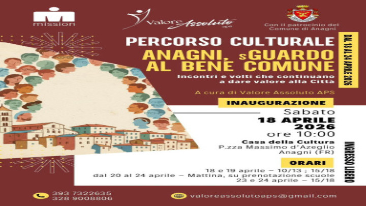 Ad Anagni, dal 18 al 24 aprile 2026, la Casa della Cultura ospiterà "Anagni: sGUARDO al bene comune", un percorso culturale ed educativo promosso da Valore Assoluto APS con il patrocinio del Comune, pensato per offrire ai visitatori un'esperienza immersiva tra memoria e presente, stimolando una riflessione sui temi del bene comune, della responsabilità e della comunità; l'inaugurazione è prevista per sabato 18 aprile alle ore 10 con ingresso libero, mentre il progetto si rivolge in particolare a famiglie e studenti delle scuole secondarie, integrandosi con i percorsi di educazione civica e storia attraverso ambienti tematici che favoriscono osservazione, confronto e partecipazione; per le scuole sono previste visite gratuite su prenotazione dal 20 al 24 aprile in orario mattutino, con percorsi della durata di circa un'ora e mezza, mentre per il pubblico generale l'apertura è fissata il 18 e 19 aprile (10-13 e 15-18) e il 23 e 24 aprile (15-18), offrendo così un'occasione concreta per approfondire il valore della cittadinanza attiva e del vivere condiviso.